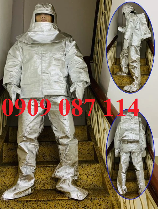 – Quần + áo chịu nhiệt: Làm bằng sợi thủy tinh tráng nhôm chống cháy không chứa amiang độc hại, chất liệu bóng chịu được nhiệt độ 500 độ.