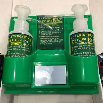 Bộ 2 chai nước dung dịch rửa mắt khẩn cấp loại gắn trên tường treo ở nơi làm việc.