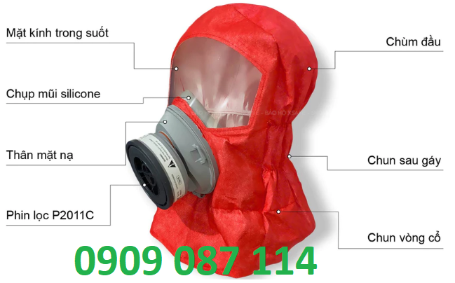 - Chùm đầu: Làm từ vải không dệt Lamilate 2 lớp, với khả năng chống thấm khí tuyệt đối, kết hợp với kính chắn giúp bảo vệ mặt khỏi hơi độc.