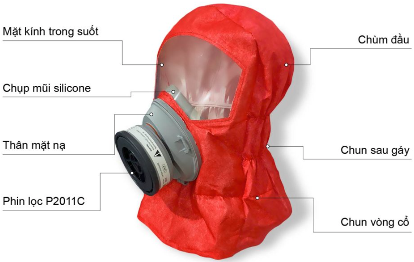 - Chùm đầu : làm từ vải không dệt Lamilate 2 lớp , với khả năng chống thấm khí tuyệt đối, kết hợp với kính chắn giúp bảo vệ mặt khỏi hơi độc