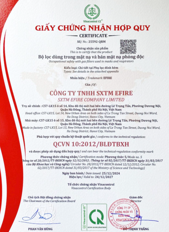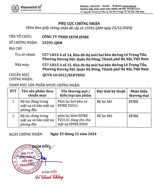 Các chứng nhận của mặt nạ phòng độc EFIRE EH60