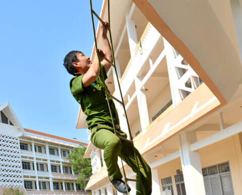 Công an PCCC test thử oộ an toàn của thang dây bố dù thoát hiểm