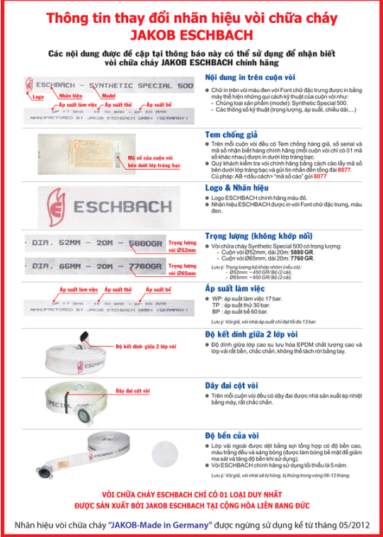 MED 96/98/EC SBG; ONORM F 2106; Russian Maritime Regesiter.Jakob Eschbach không sản xuất vòi chữa cháy loại 2. Eschbach là thương hiệu nhận dạng mới của vòi chữa cháy chính hãng sản xuất bởiJakob Eschbach Gmbh. Thương hiệu vòi chữa cháy Jakob- Made in Germany " được ngừng sử dụng kể từ tháng 5/ 2012